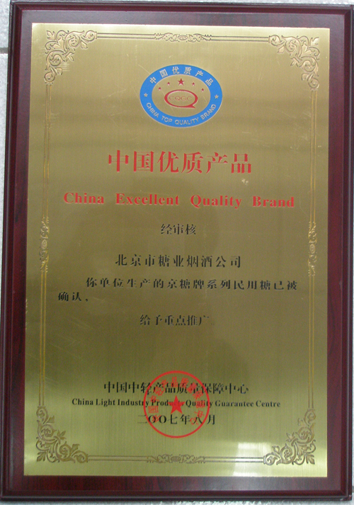 2007年,公司的京糖牌系列民用糖产品被中国中轻产品质量保障中心评为中国优质产品称号。