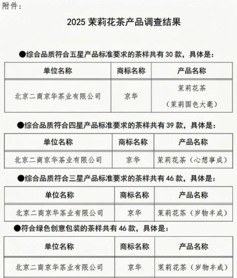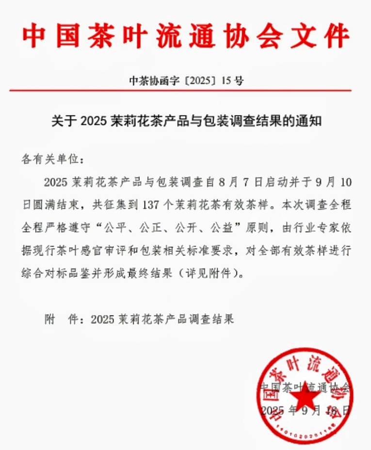 (中国茶叶流通协会《关于2025茉莉花茶产品与包装调查推选结果的通知》)